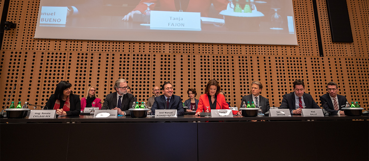 Invitado por su homóloga eslovena, Tanja Fajon, el jefe de la diplomacia española participó en la Conferencia anual de Embajadores de Eslovenia, donde informó sobre las prioridades de la Presidencia española del Consejo Europeo a partir del 1 de julio. José Manuel Albares destacó que España ejercerá su presidencia europea con el liderazgo que requiere Europa en este momento crucial y con el objetivo de proteger a los europeos y mantener la unidad entre los socios. Asimismo, señaló que España promoverá mejorar las relaciones entre la Unión Europea y América Latina, región que definió como "la más 'eurocompatible' del planeta".
