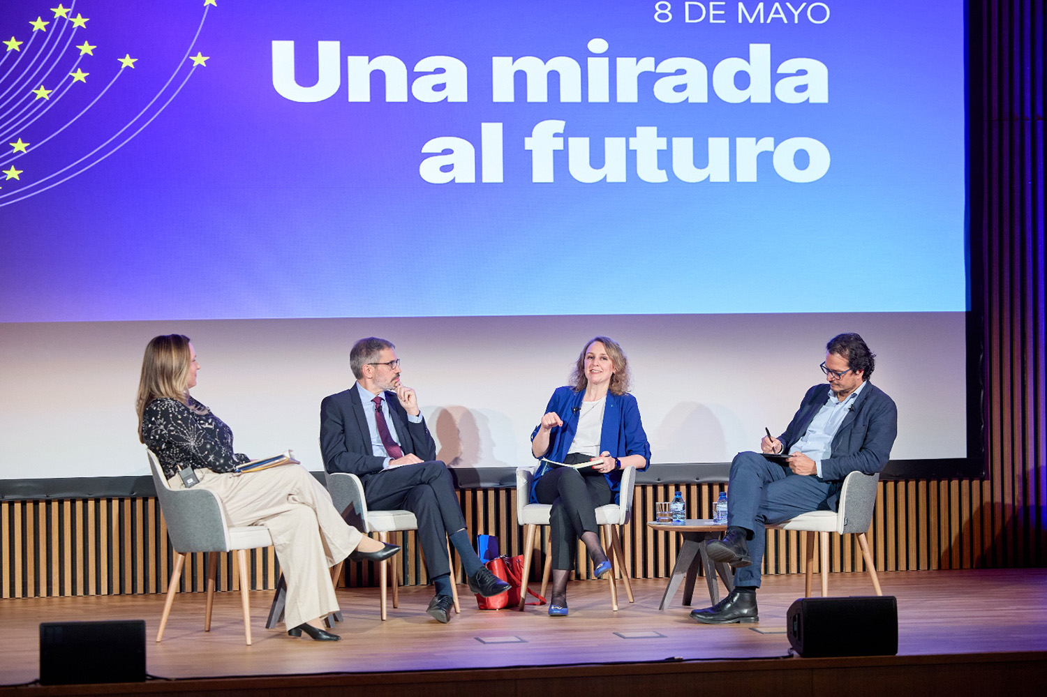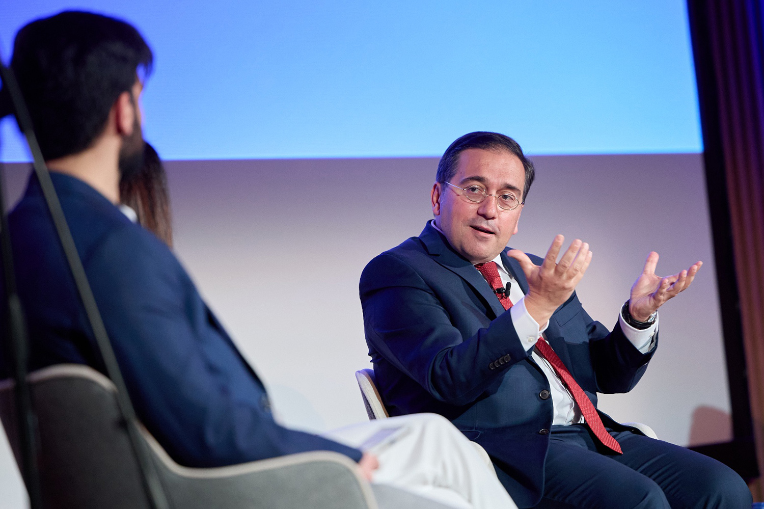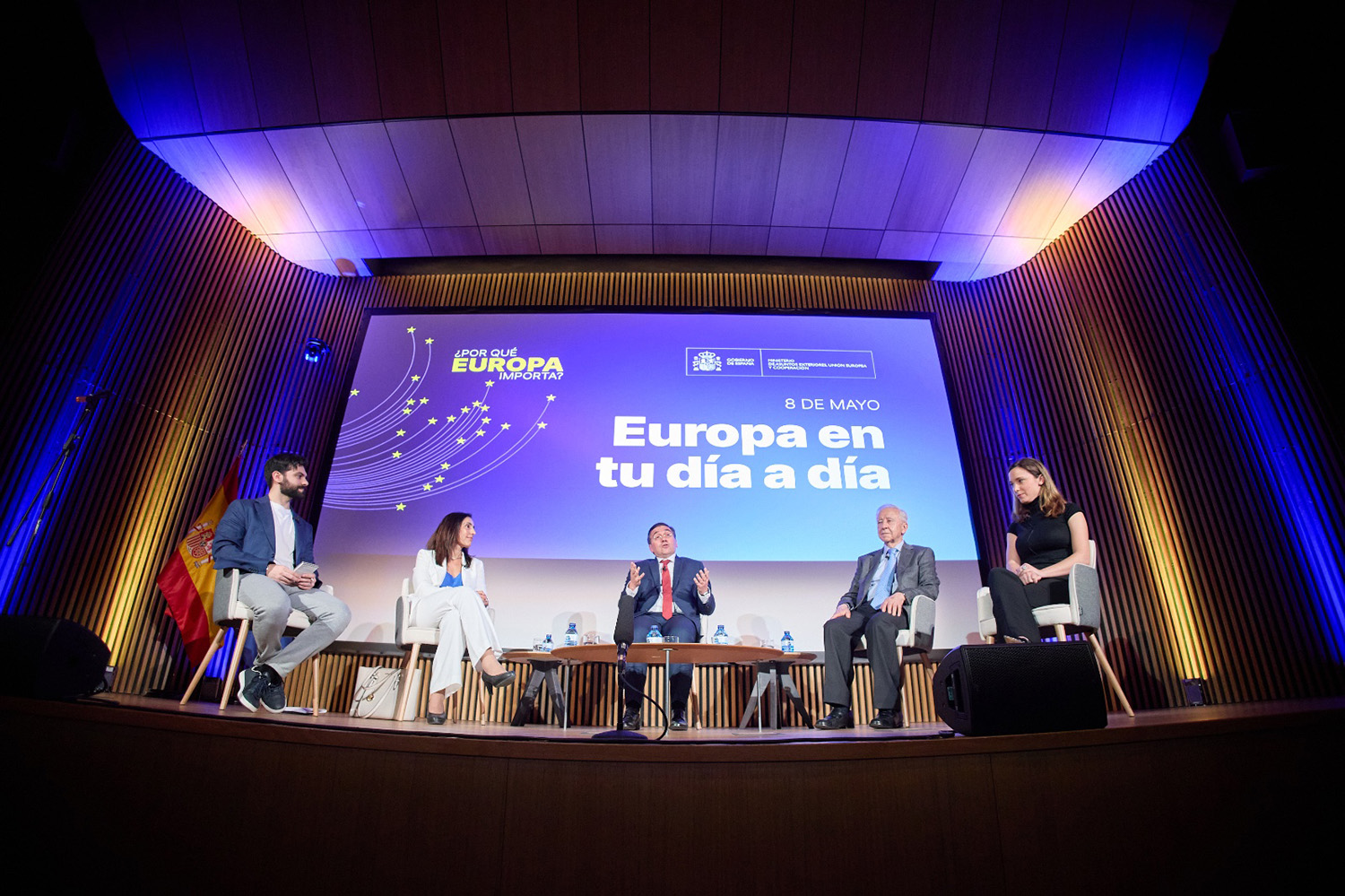 En la primera sesión del coloquio, el ministro José Manuel Albares ha conversado sobre “Europa en tu día a día” con Lázaro González, presidente de la Plataforma de Mayores y Pensionistas; Cristina Barreto, directora de la Oficina Técnica de Asuntos Europeos de la ONCE, y Alejandra Fernández, fundadora de Junior Female Leaders. Karim Hallal, divulgador sobre asuntos de la Unión Europea, ha sido el encargado de moderar el acto.
