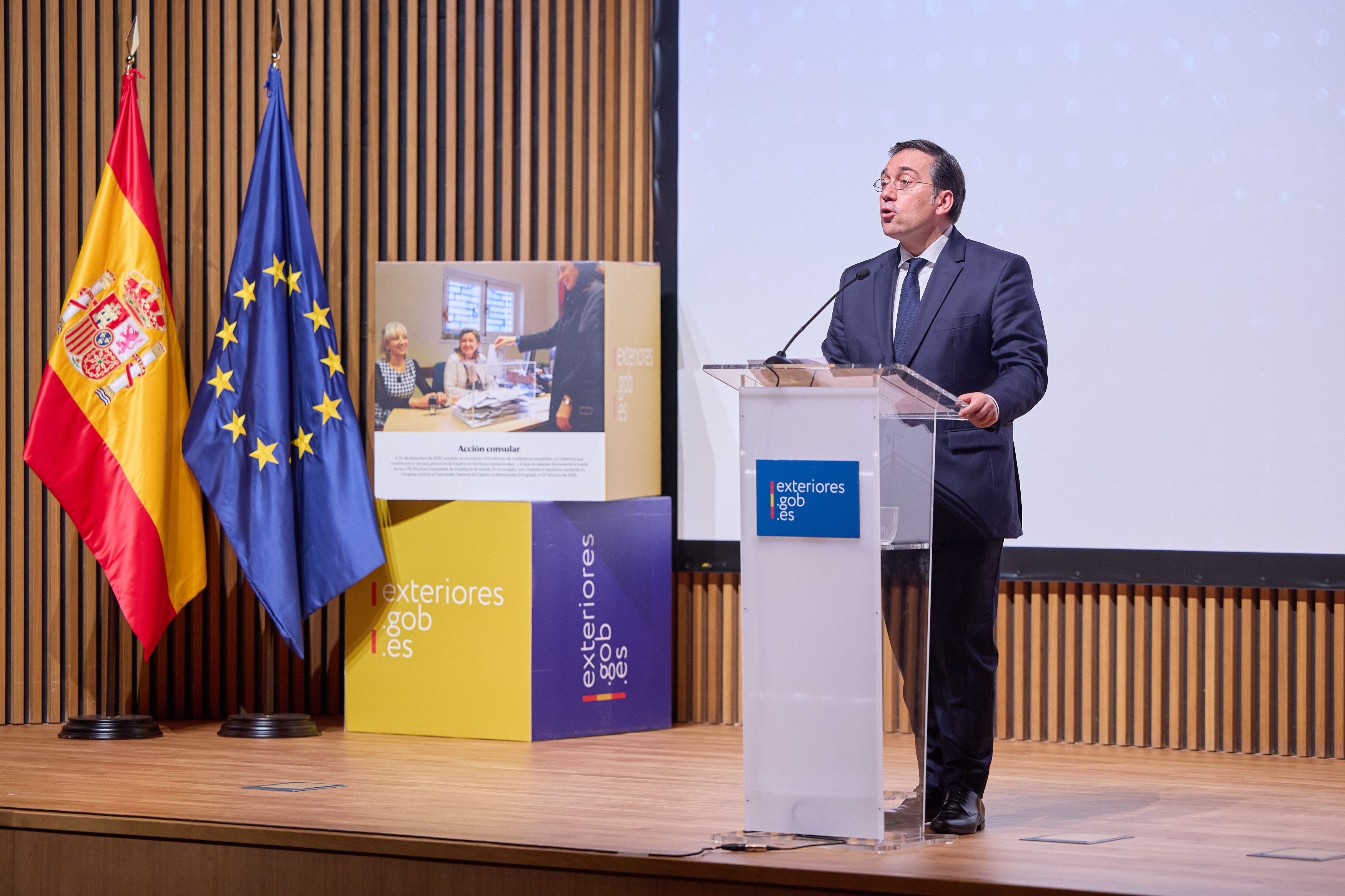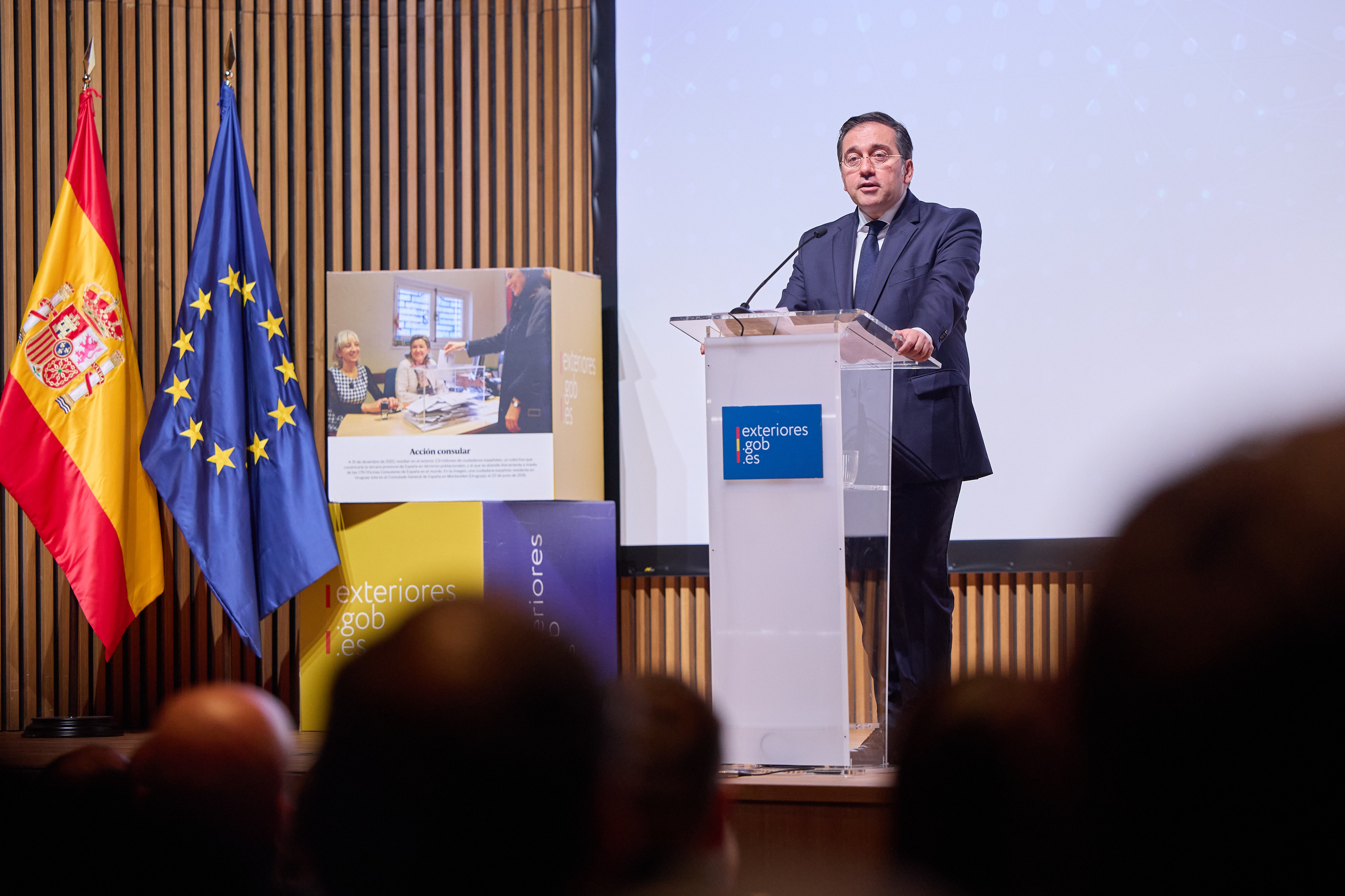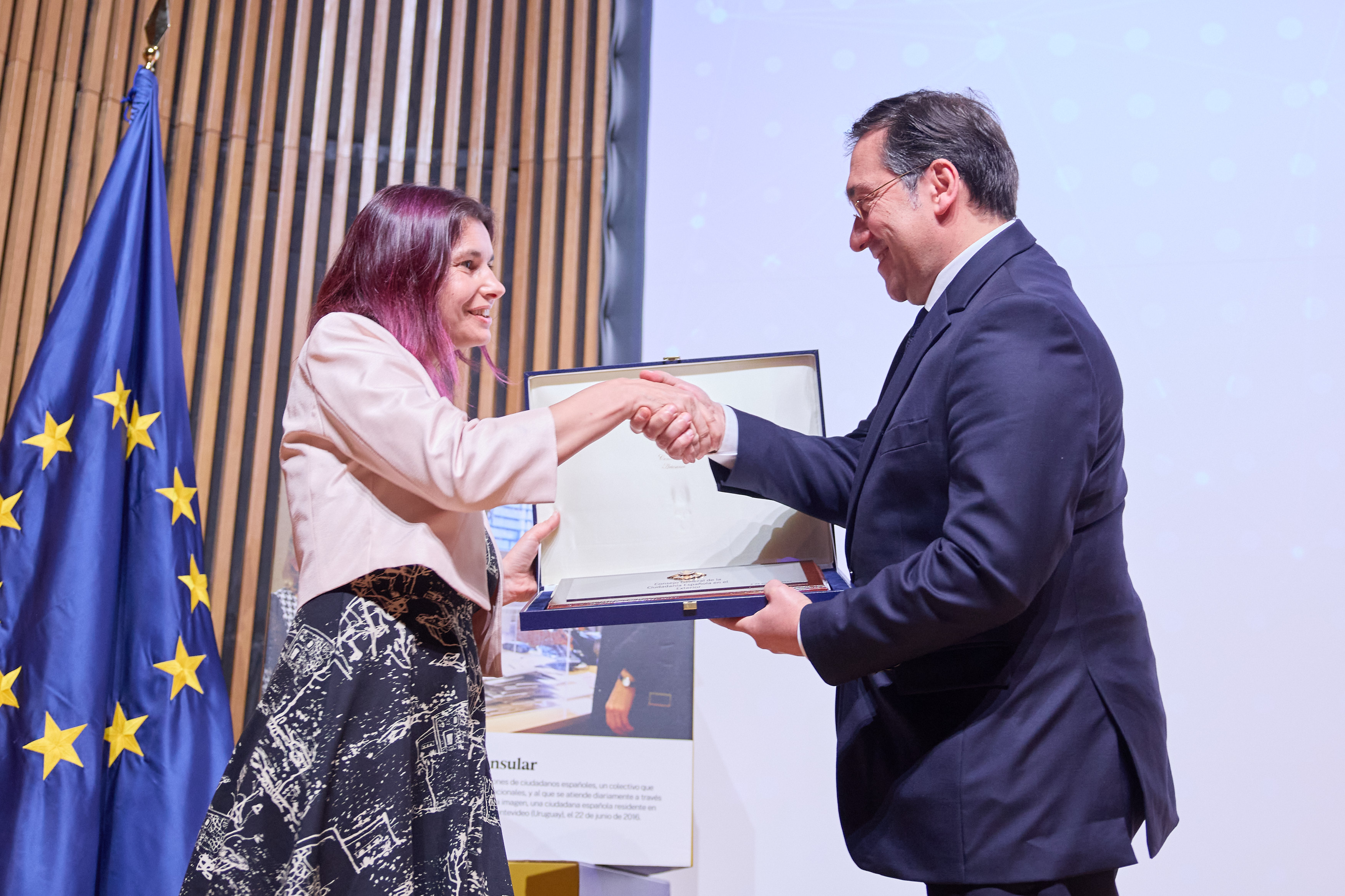 En la clausura del acto, el ministro José Manuel Albares ha condecorado al Consejo General de la Ciudadanía Española en el Exterior, entregando la Placa de Honor de la Orden del Mérito Civil a la presidenta de esta institución.