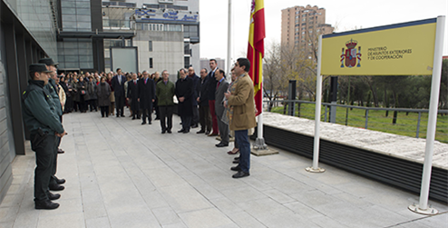 El personal del Ministerio de Asuntos Exteriores y de Cooperación ha guardado esta mañana un minuto de silencio en memoria de los policías Isidro Sanmartín Hernández y Jorge García Tudela, muertos el pasado viernes en el atentado terrorista perpetrado por milicianos talibanes en las inmediaciones de la Embajada de España en la capital de Afganistán.