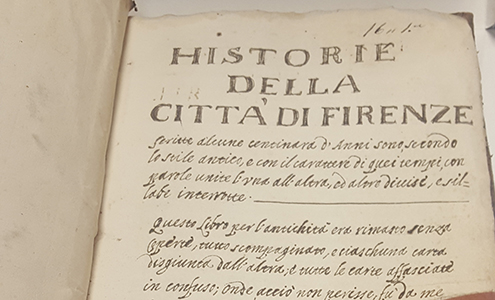 - 'Historie de la Cittá di Firenze'. Libro sin paginar, con cartas incluidas descolocadamente y sin cubierta que fue ordenado y paginado por Verginia Ubaldini en 1698. La cubierta es de guadamecí, cuero repujado y pintado que se utilizaba habitualmente para forrar arquetas, decorar paredes y techumbres y encuadernar.