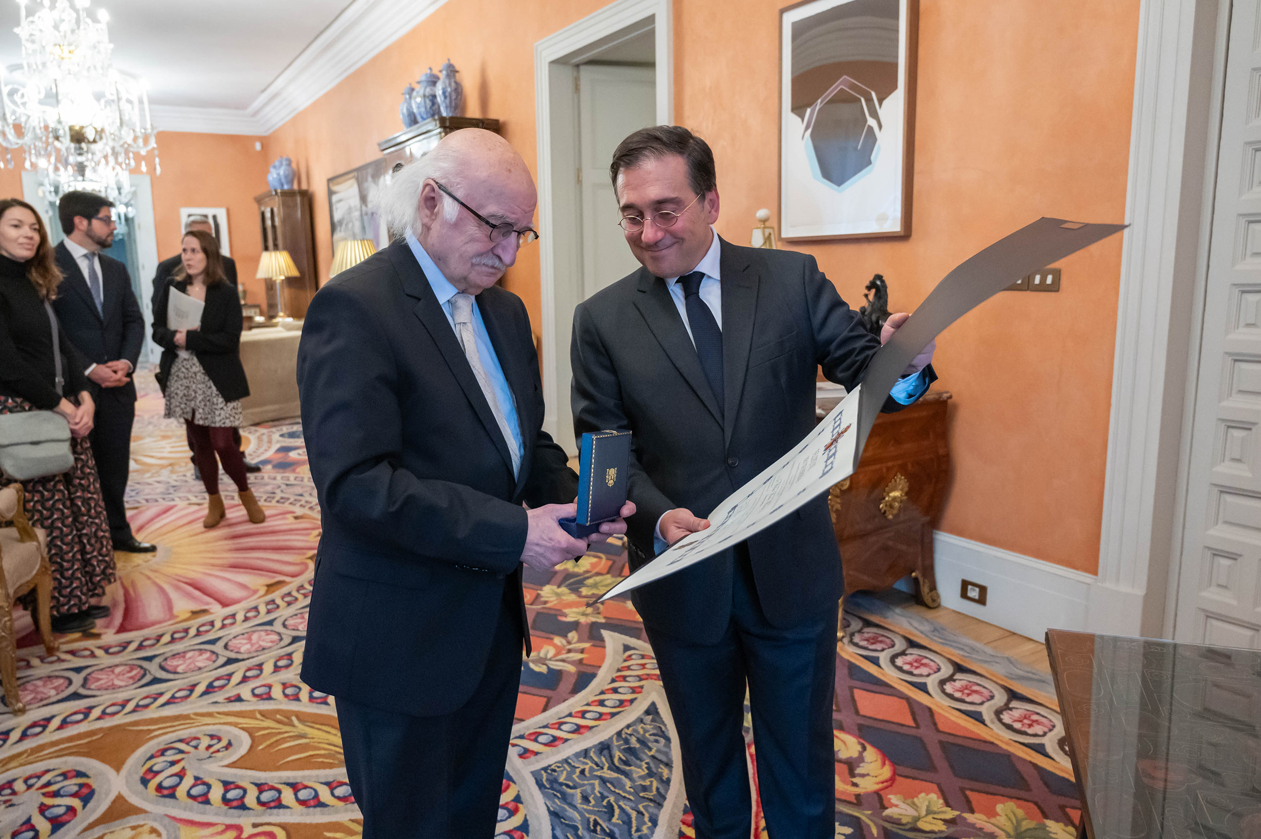 El ministro de Asuntos Exteriores, Unión Europea y Cooperación, José Manuel Albares, ha condecorado hoy al superviviente del Holocausto Pedro René Pérez con la Encomienda del Mérito Civil por el coraje demostrado al contar al mundo su experiencia y transmitir un mensaje de paz y fraternidad.