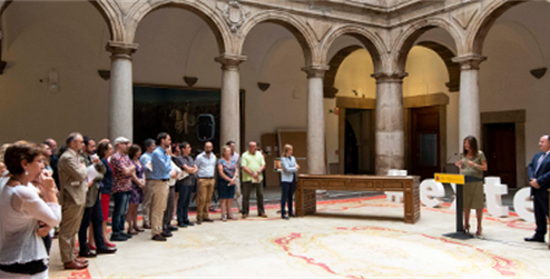 La denominación “Pieza de Estado” es un homenaje y un recuerdo a la primera Secretaría de Estado, institución creada en 1714 por el monarca Felipe V y que asumía, entre otras funciones, las relaciones exteriores. A mediados del siglo XIX, este departamento se convertía en el Ministerio de Estado, del que es heredero directo el actual Ministerio de Asuntos Exteriores, Unión Europea y Cooperación.
