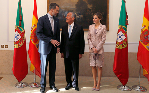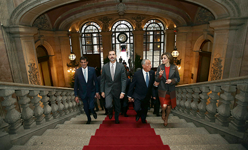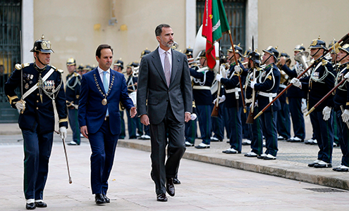 S.M. el Rey, junto al acalde de Lisboa, Fernando Medina, a su llegada al Ayuntamiento de la capital.