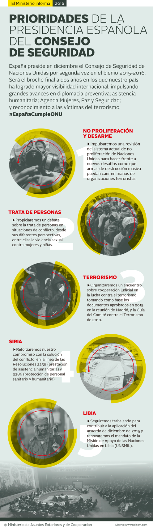 En este mes, España impulsará un amplio programa de trabajo que incluye tres iniciativas cuyo hilo conductor es la lucha contra el terrorismo, si bien abordada desde diferentes ángulos: cooperación judicial, no proliferación y lucha contra la trata de personas. Así, el ministro de Justicia, Rafael Catalá, presidirá el día 12 un debate de alto nivel sobre cooperación judicial, tomando como base los documentos aprobados en julio de 2015 en la reunión de Madrid sobre combatientes terroristas extranjeros y la Guía para la cooperación judicial internacional de 2010 del Comité contra el Terrorismo.