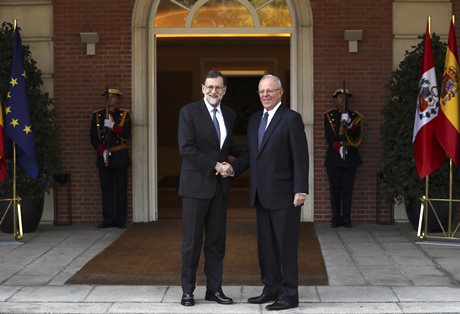 El presidente del Gobierno, Mariano Rajoy, saluda al presidente de la República del Perú, Pedro Pablo Kuczynski a su llegada al Palacio de la Moncloa donde ambos madatarios mantuvieron una reunión en el primer día de la estancia de Pedro Pablo Kuczynski en España. FOTO EFE